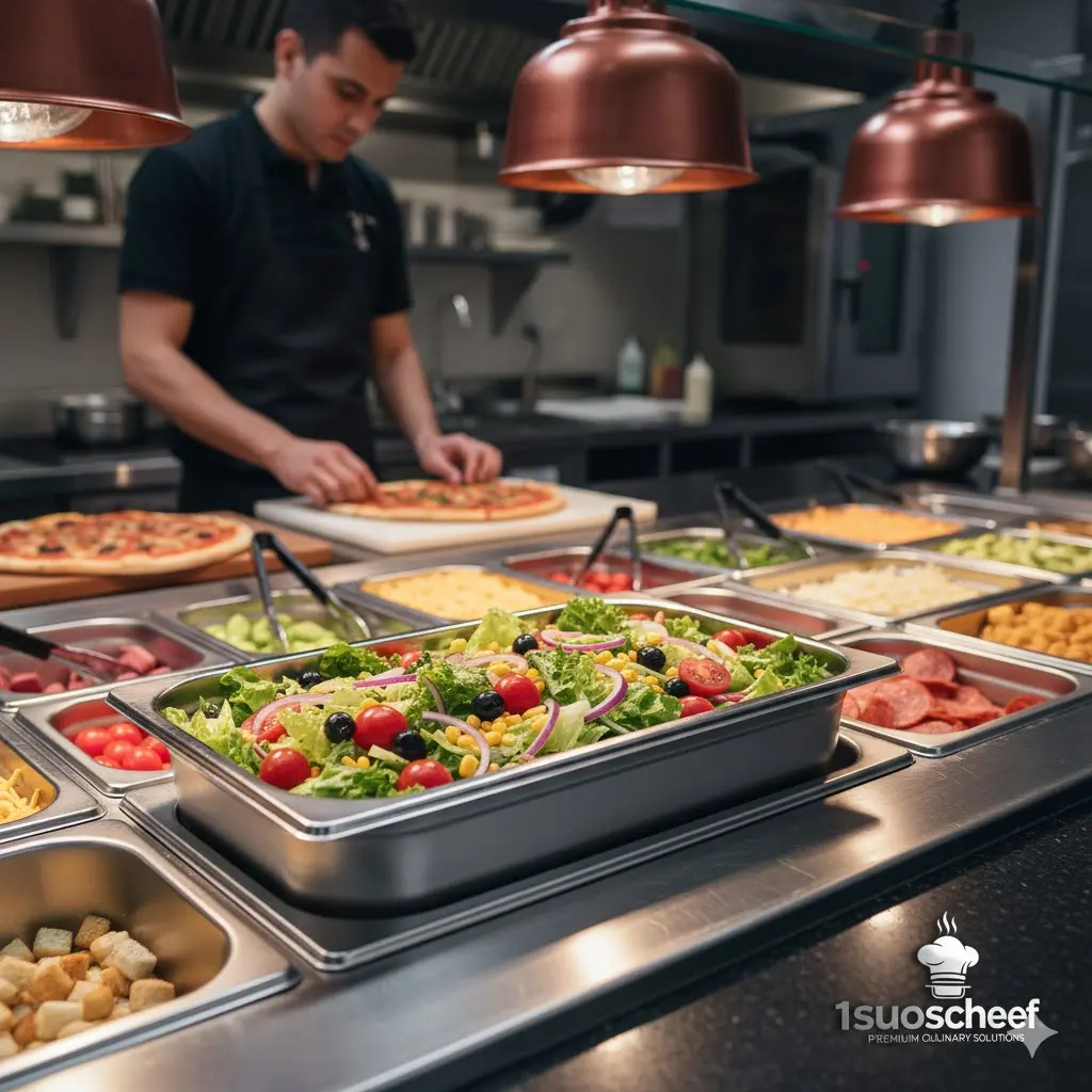 پیشنهاد حرفهای ۱سوسشف:این سایز برای موادی که نباید روی هم انباشته و له شوند (مانند گوجهفرنگی اسلایس شده، قارچ یا پنیر پیتزا) بهترین انتخاب است. همچنین به دلیل لبههای پهن و دقیق، به خوبی در ریلهای تاپینگ فیکس شده و از لغزش ظرف جلوگیری میکند.